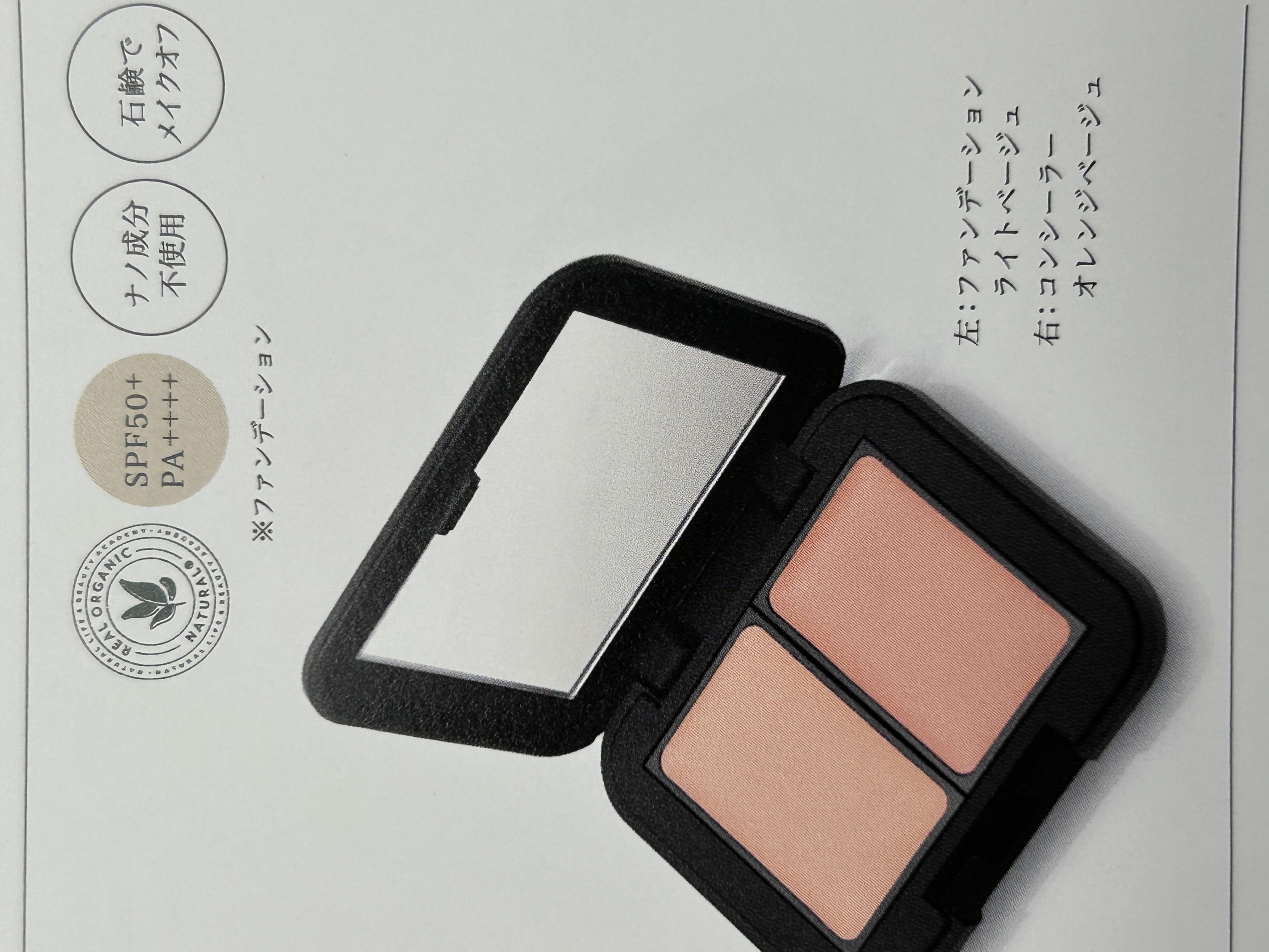 特徴・ 使用方法 | ・カバーファンデーション(ライトベージュ)SPF50+ SPF++++ ・コンシーラー(オレンジベージュ) ◎カバー力があるのに自然な仕上がり。 ◎ウォータープルーフ処方で高いUV効果(カバーファンデーションのみSPF50+SPF++++)、ナノ成分不使用。 ◎皮脂に近いオイルを配合。べたつかず崩れにくい。 適量を指、又はファンデブラシ等で取り、シミ、くすみ等気になるところへ塗り込みます。 2色を使い分けることで自然な陰影、シミの濃淡によっては2色を混ぜ合わせご使用ください。 |
